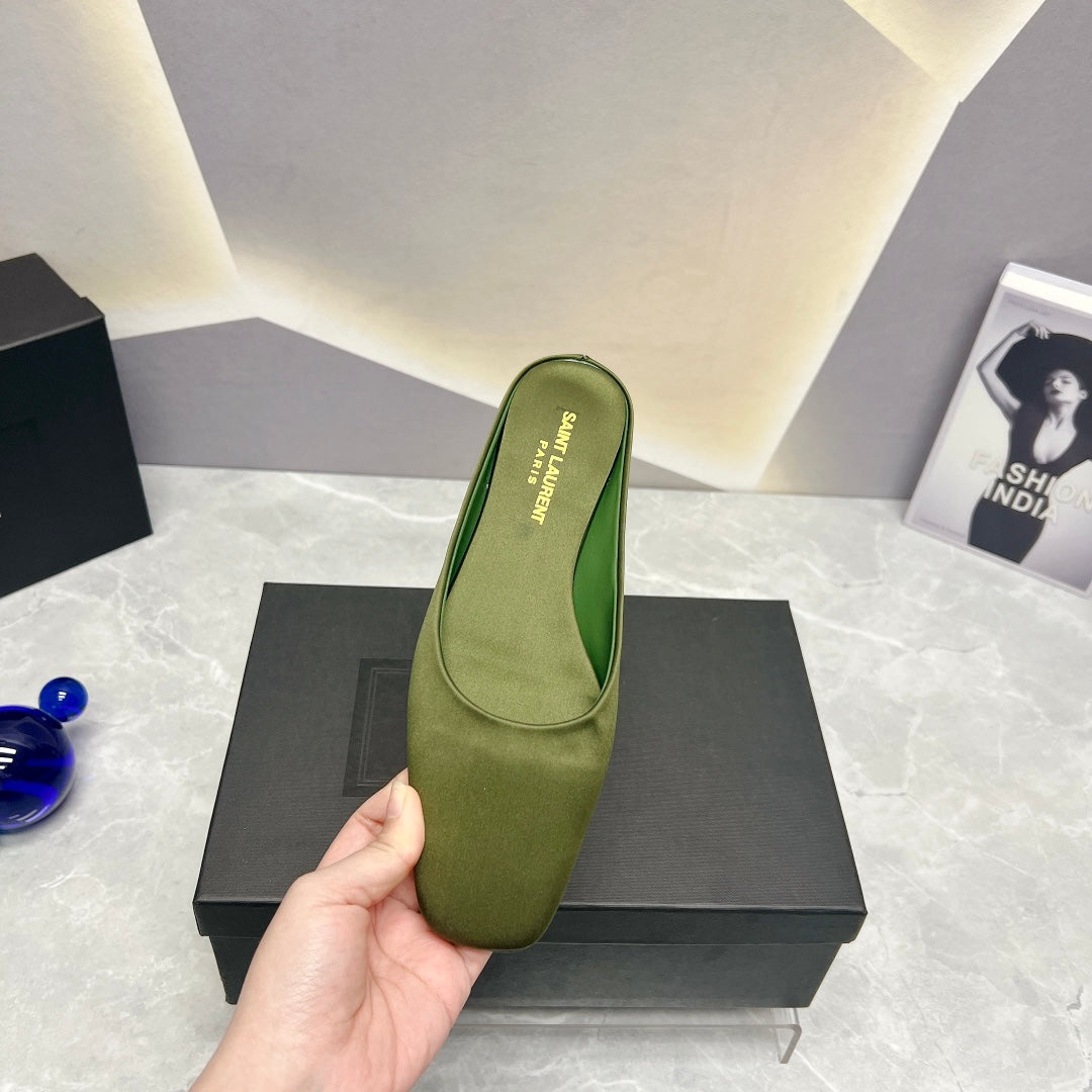 SL SQUARE TOE FLAT MULES MOSS SATIN