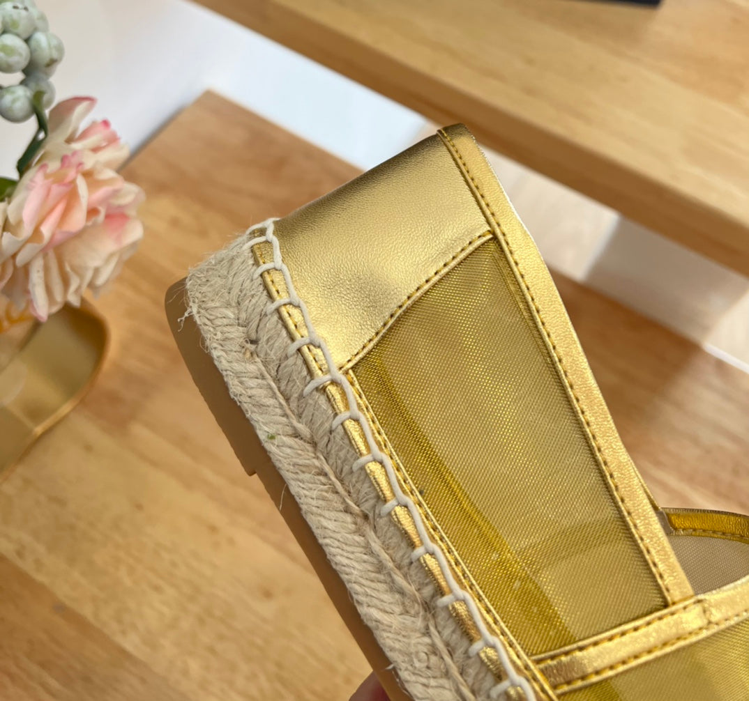SL WEDGE SANDALS METALLIC GOLD CALFSKIN AND STRAW