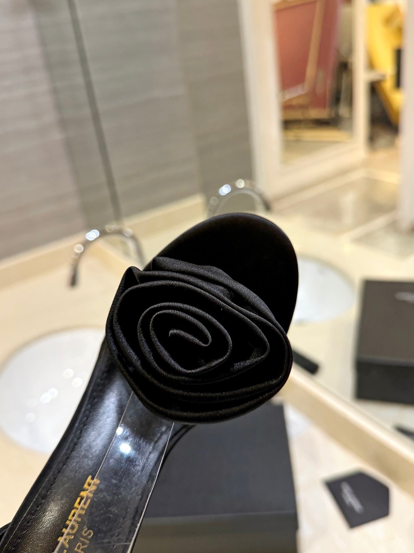 SL STRAP WHITE CRYSTAL HIGH SANDAL BLACK SATIN