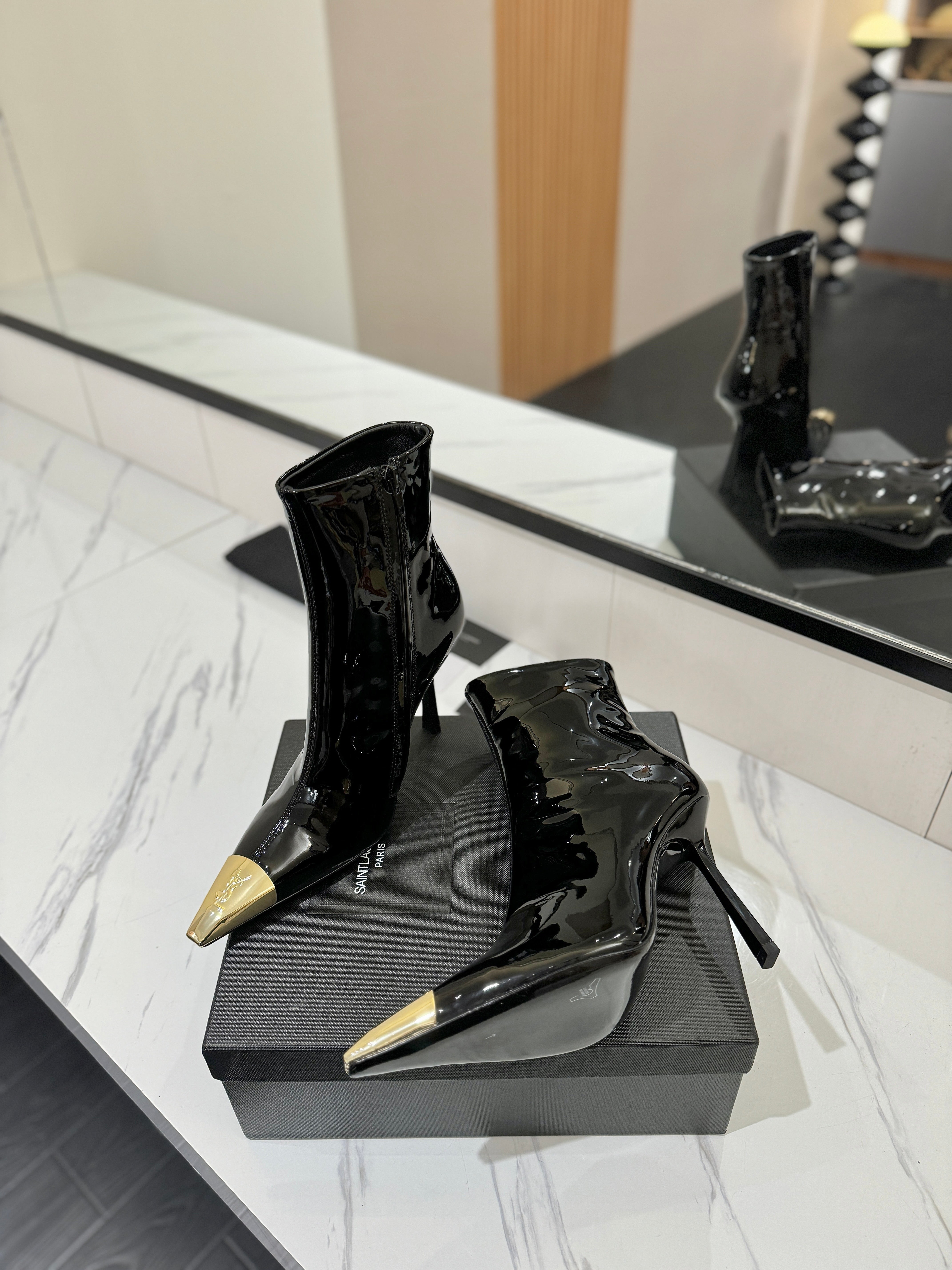 YSL 25 Metal Toe Short Boot Black Gold Patent Leather 520788