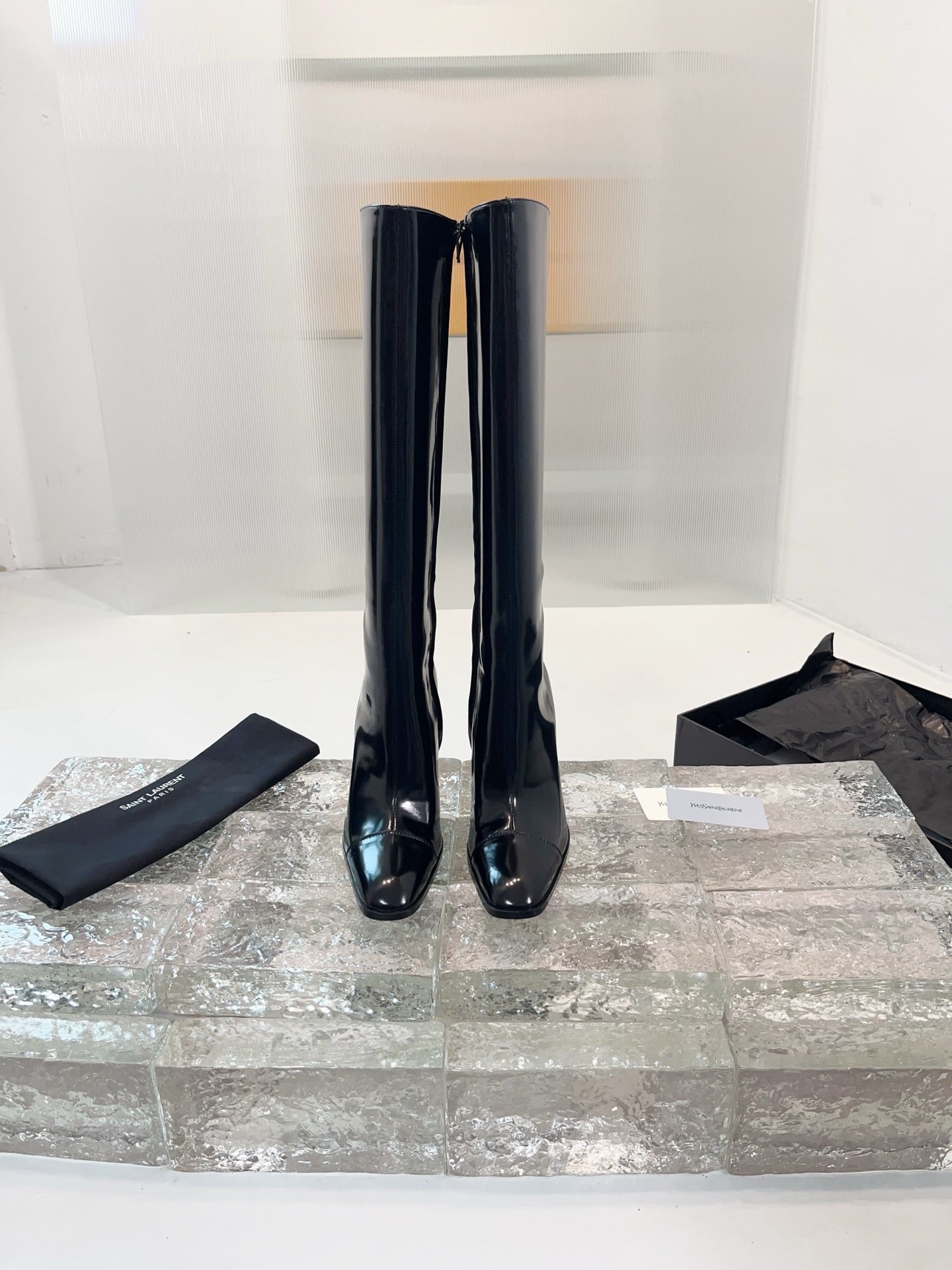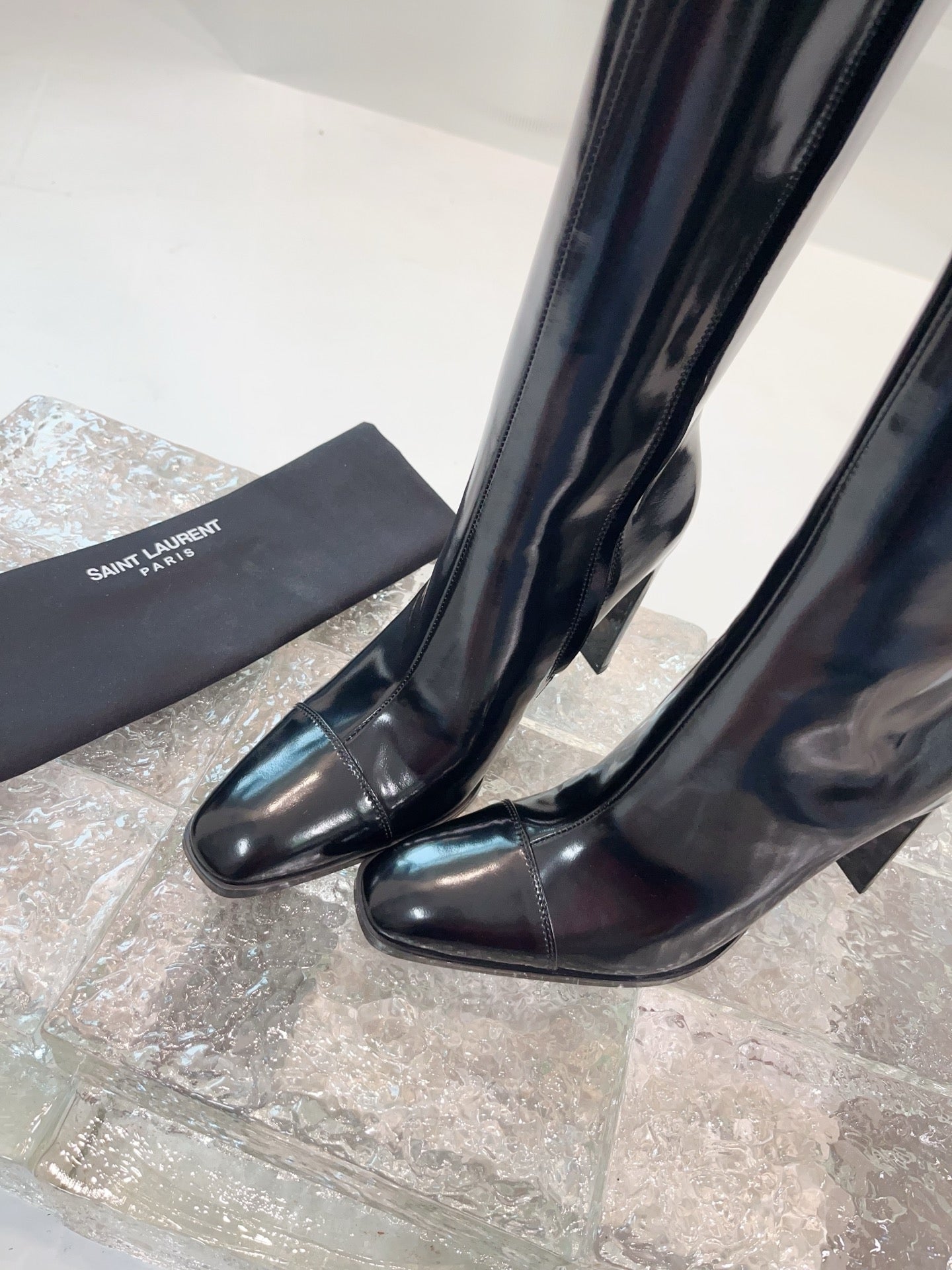 YSL 25 High Heeled Long Boot Black Patent Leather 522261