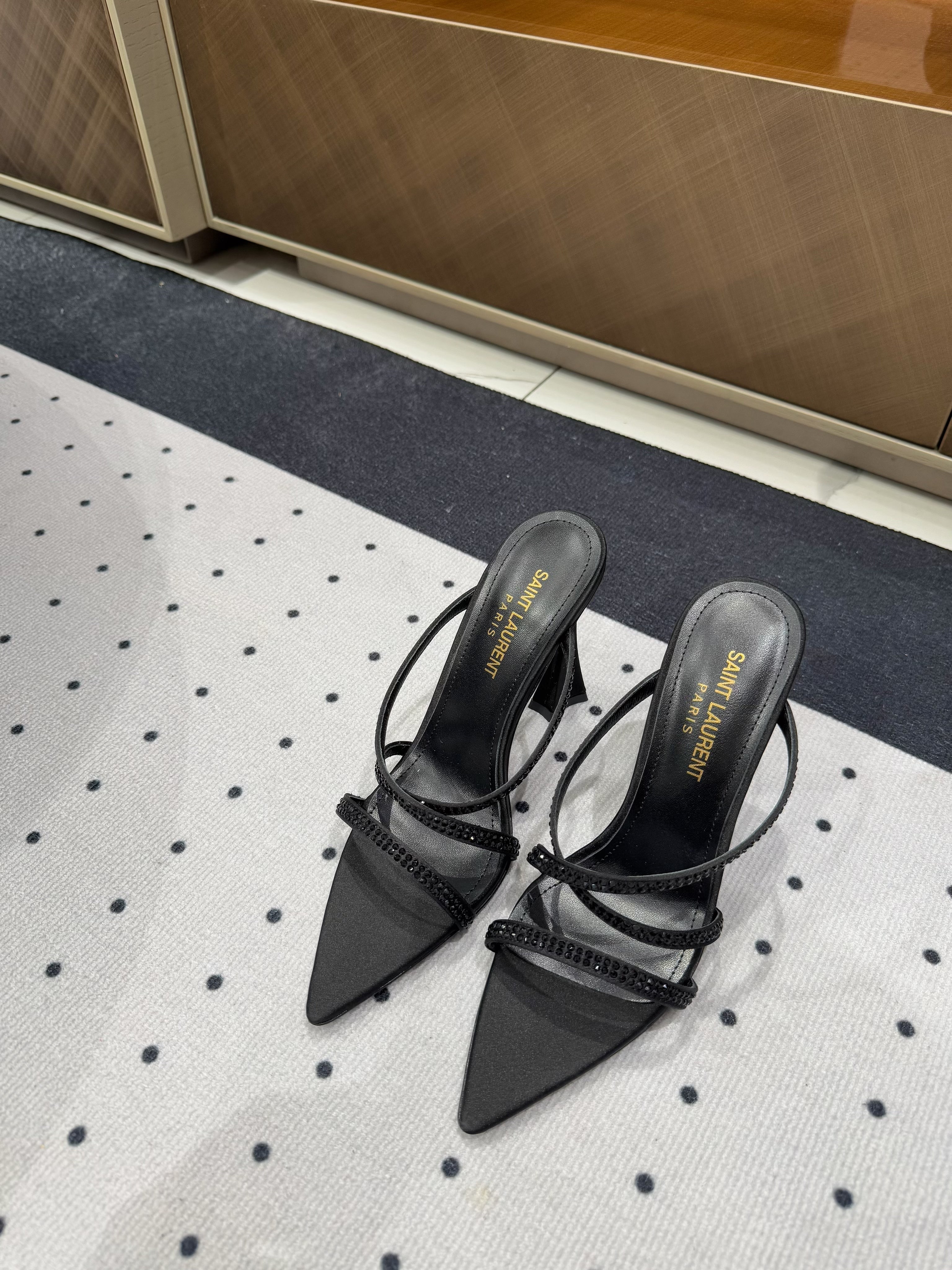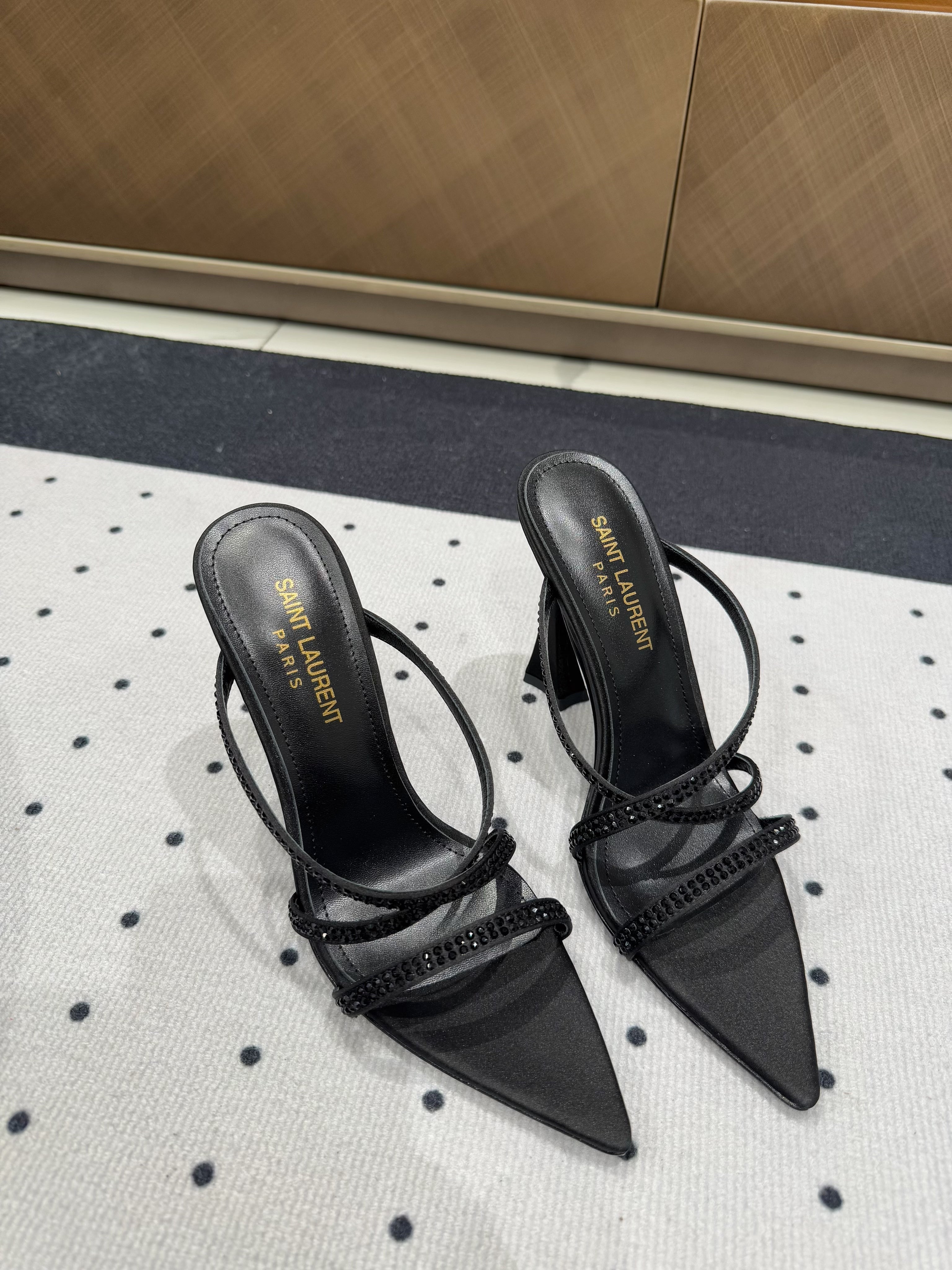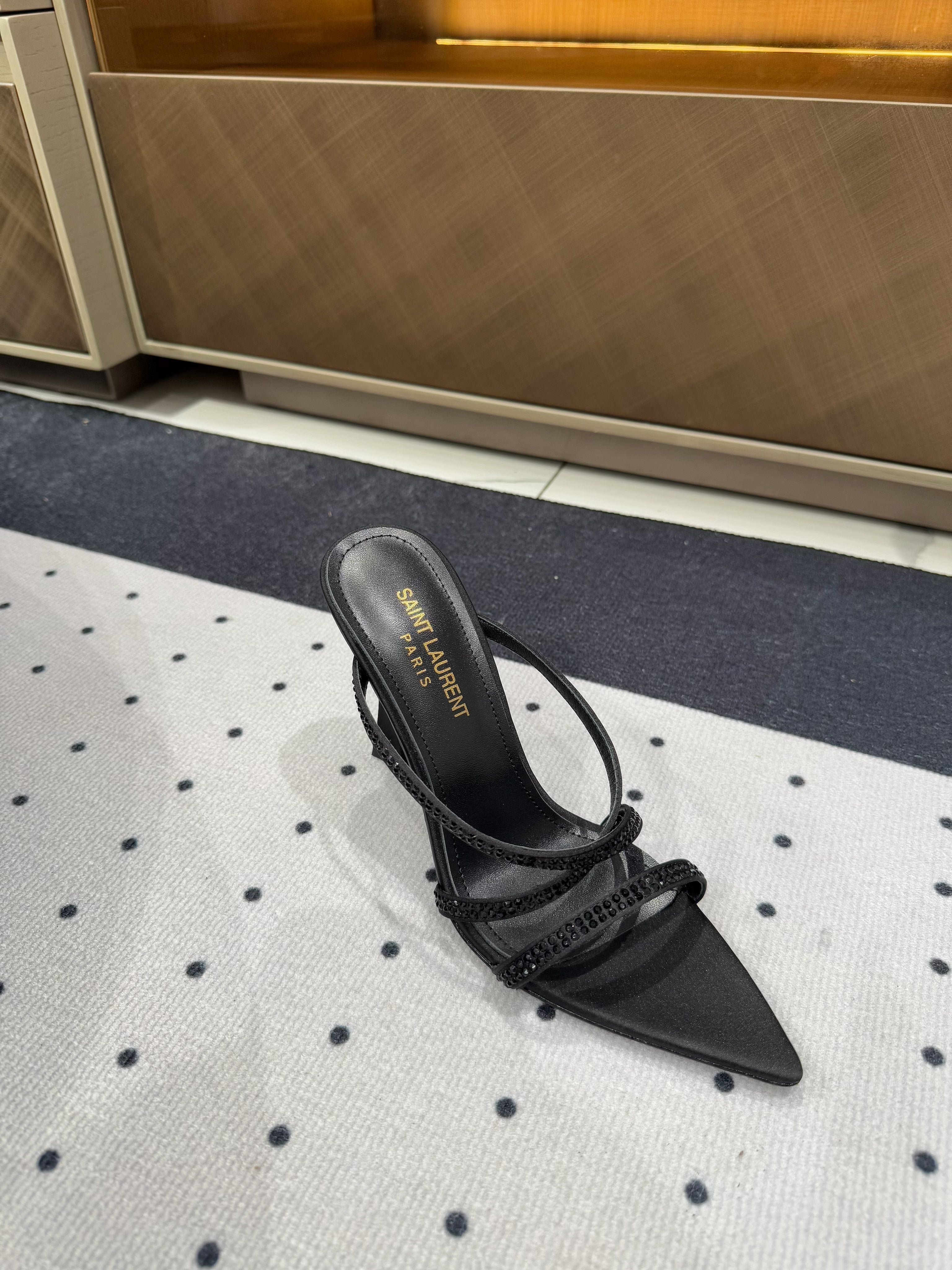 HIGH HEEL SANDALS IN BLACK SILK WTH STRAPS ATTACHED GEM