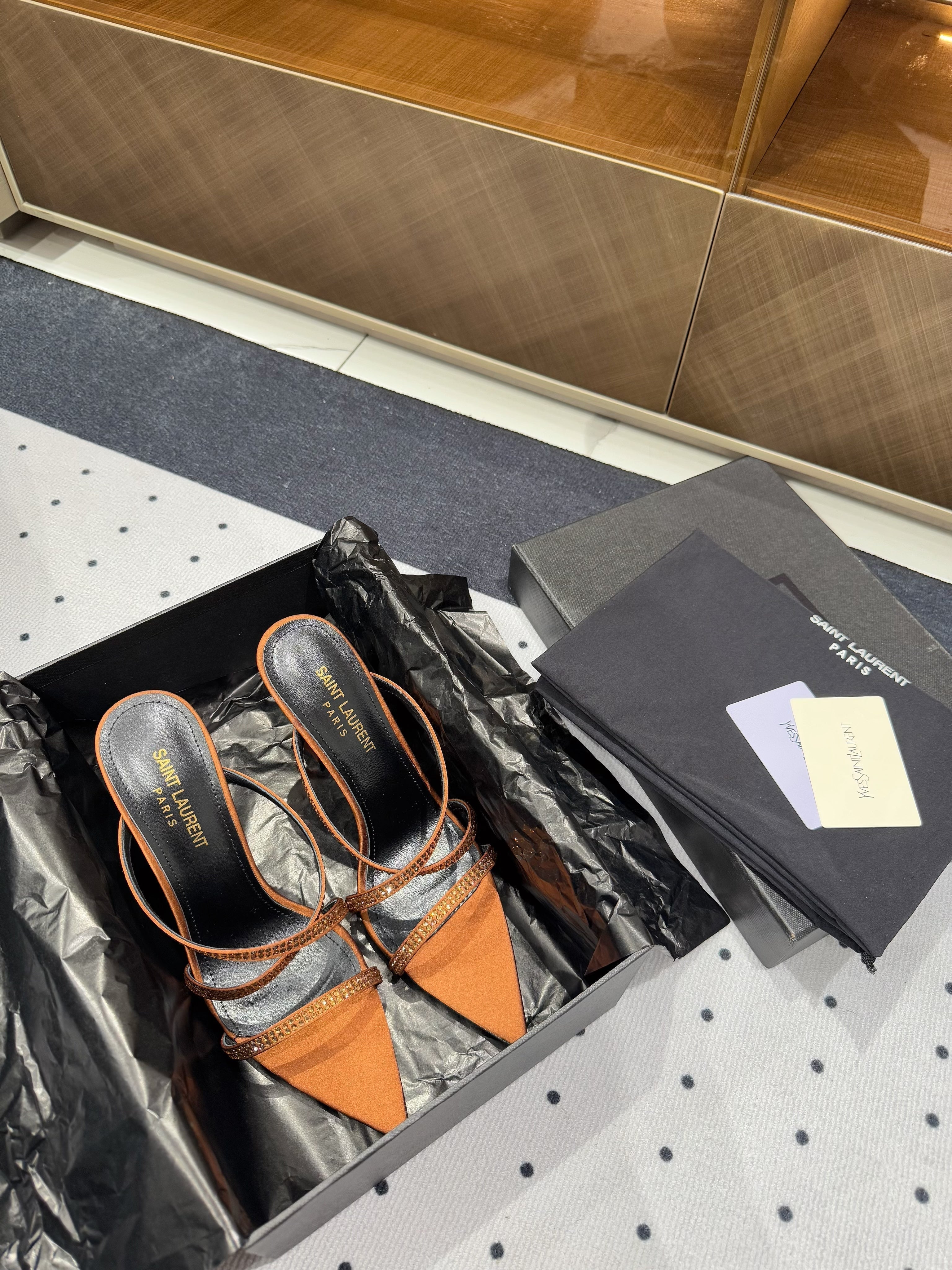 CROSS STRAP HIGH HEEL IN CHESTNUT SILK GOLD CHAIN