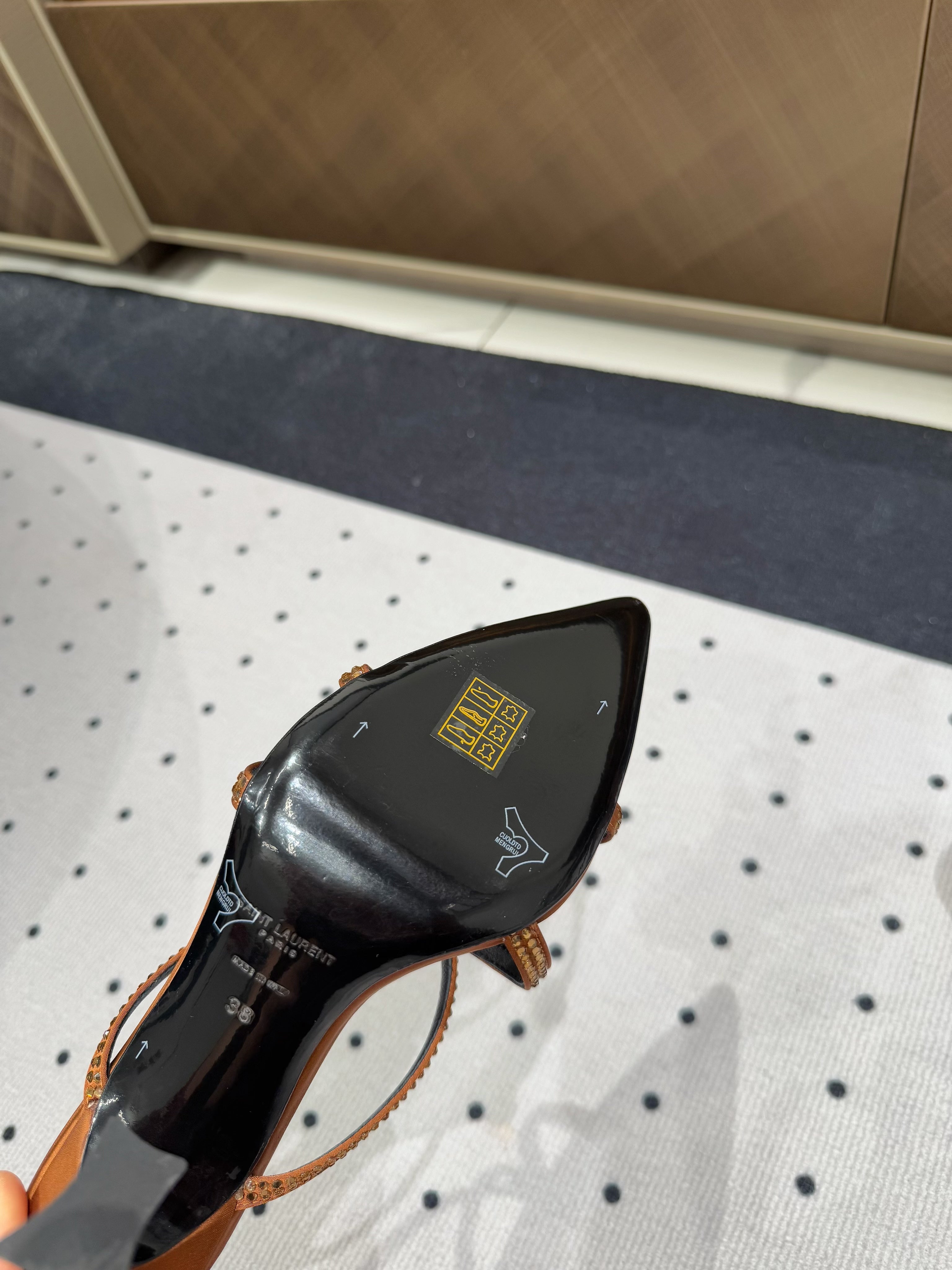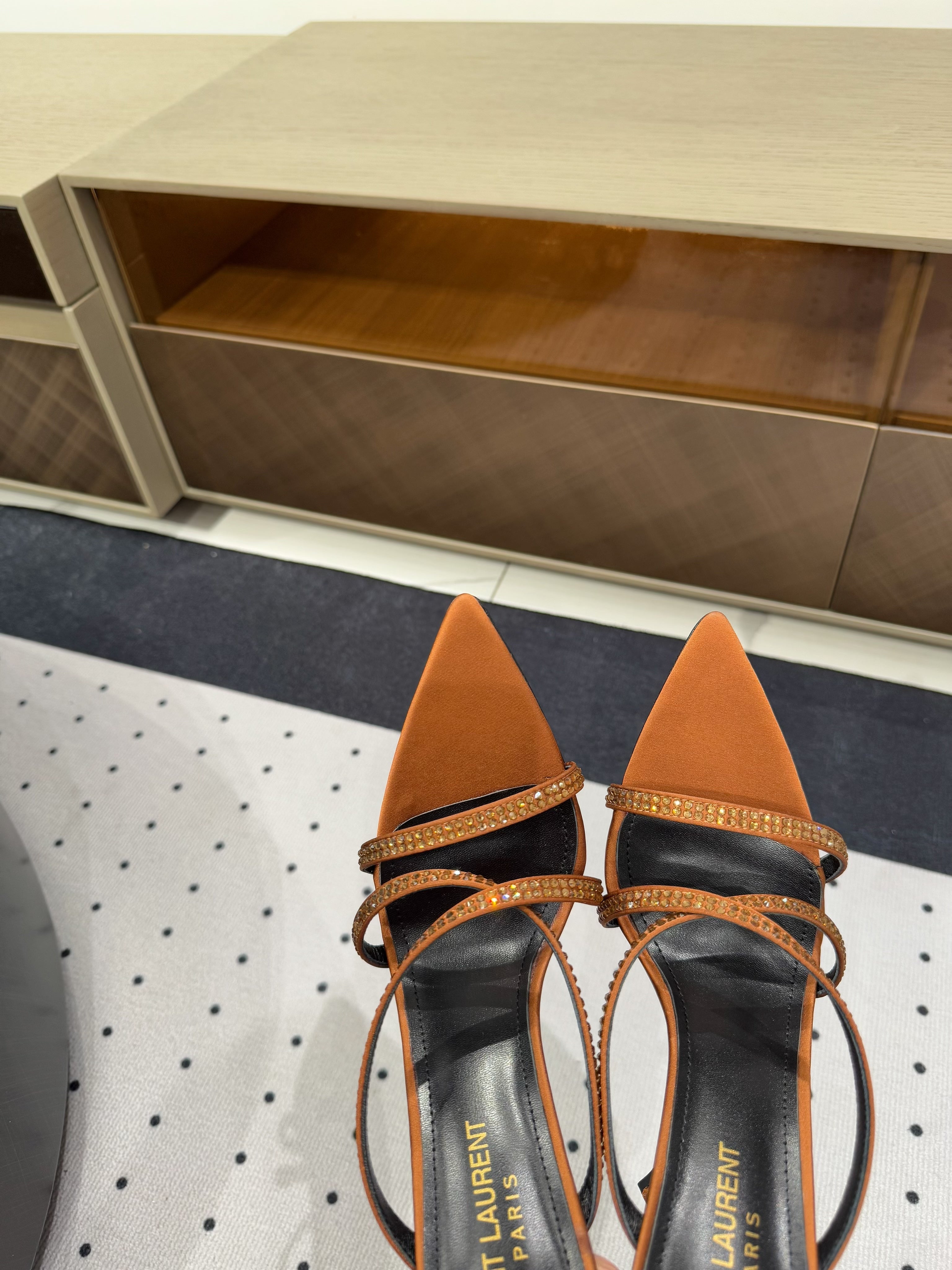 GOLD CHAIN ATTACHED HIGH SLINGBACK IN TOFFEE BROWN SILK