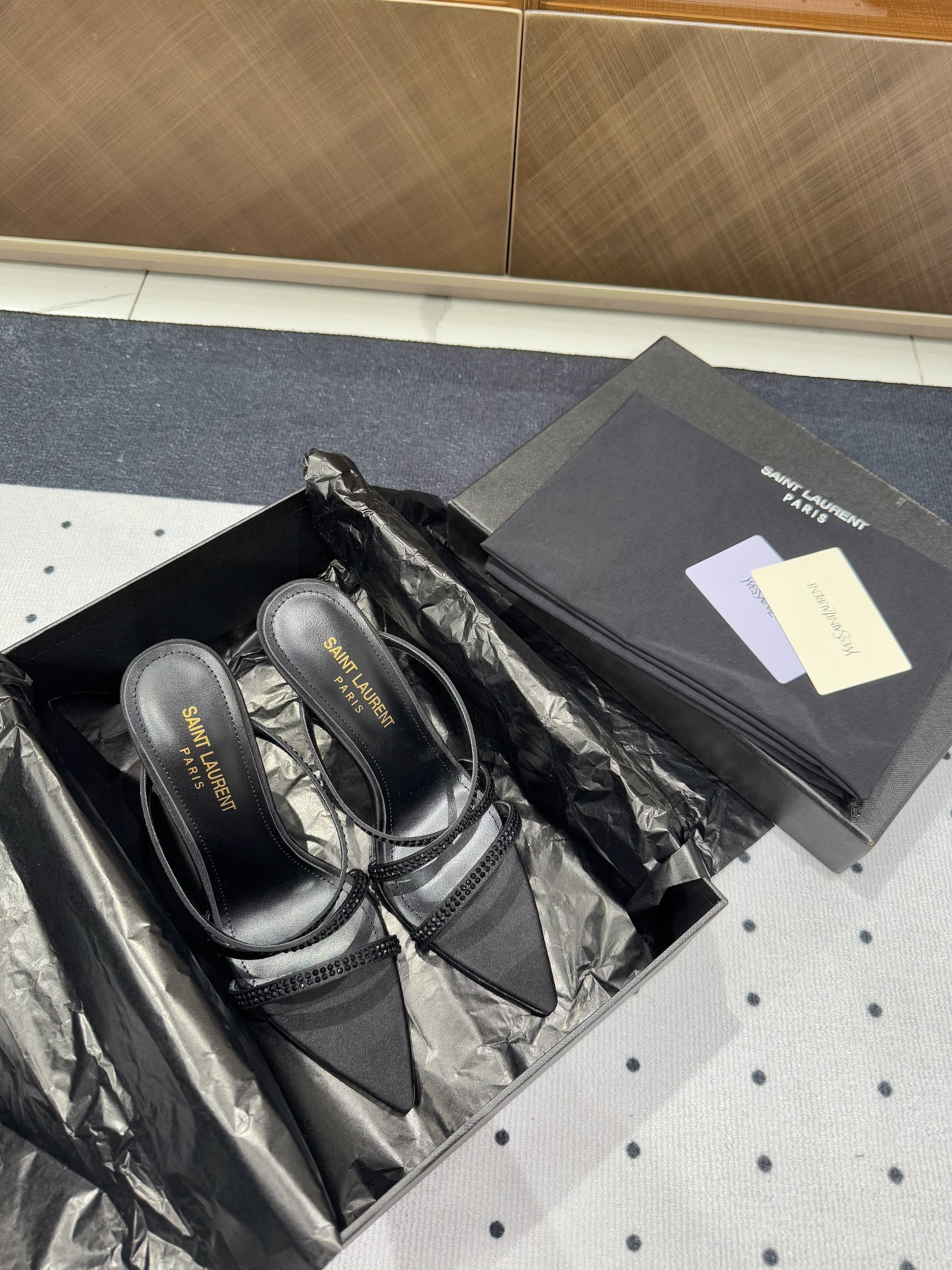 GOLD CHAIN ATTACHED HIGH SLINGBACK IN BLACK SILK