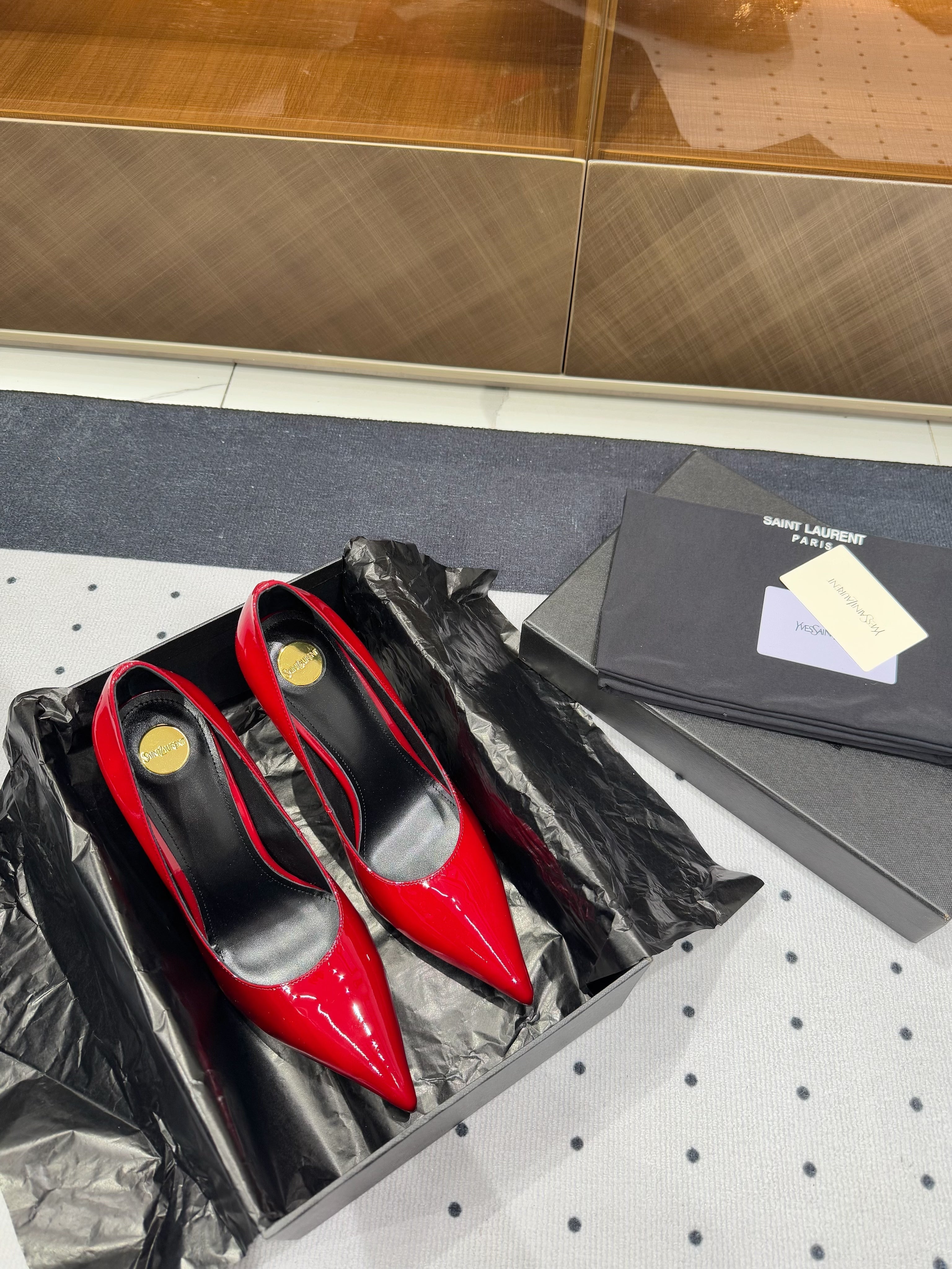 OPYUM RED HEEL SLINGBACK PUMPS IN BLACK GLOSSY CALFSKIN
