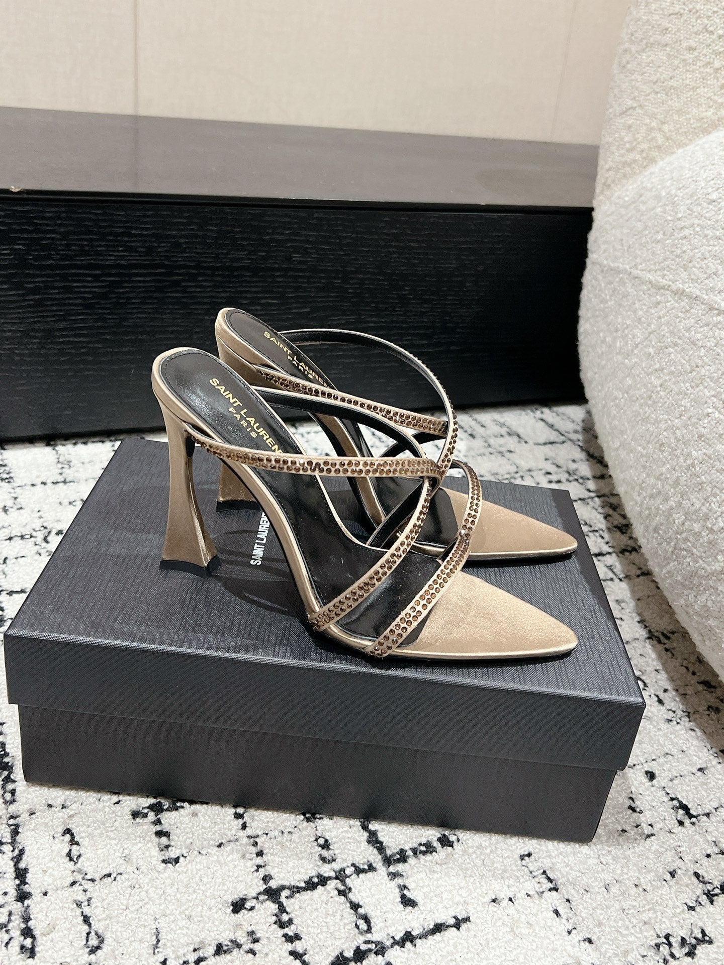HIGH RHINESTONE CROSS STRAP MULES IN BRONZE BROWN SILK