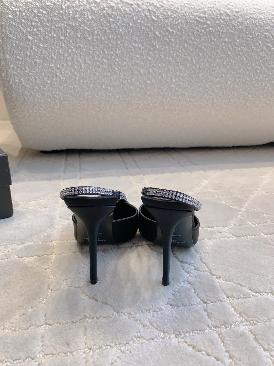 HIGH RHINESTONE CROSS STRAP MULES IN BLACK SILK