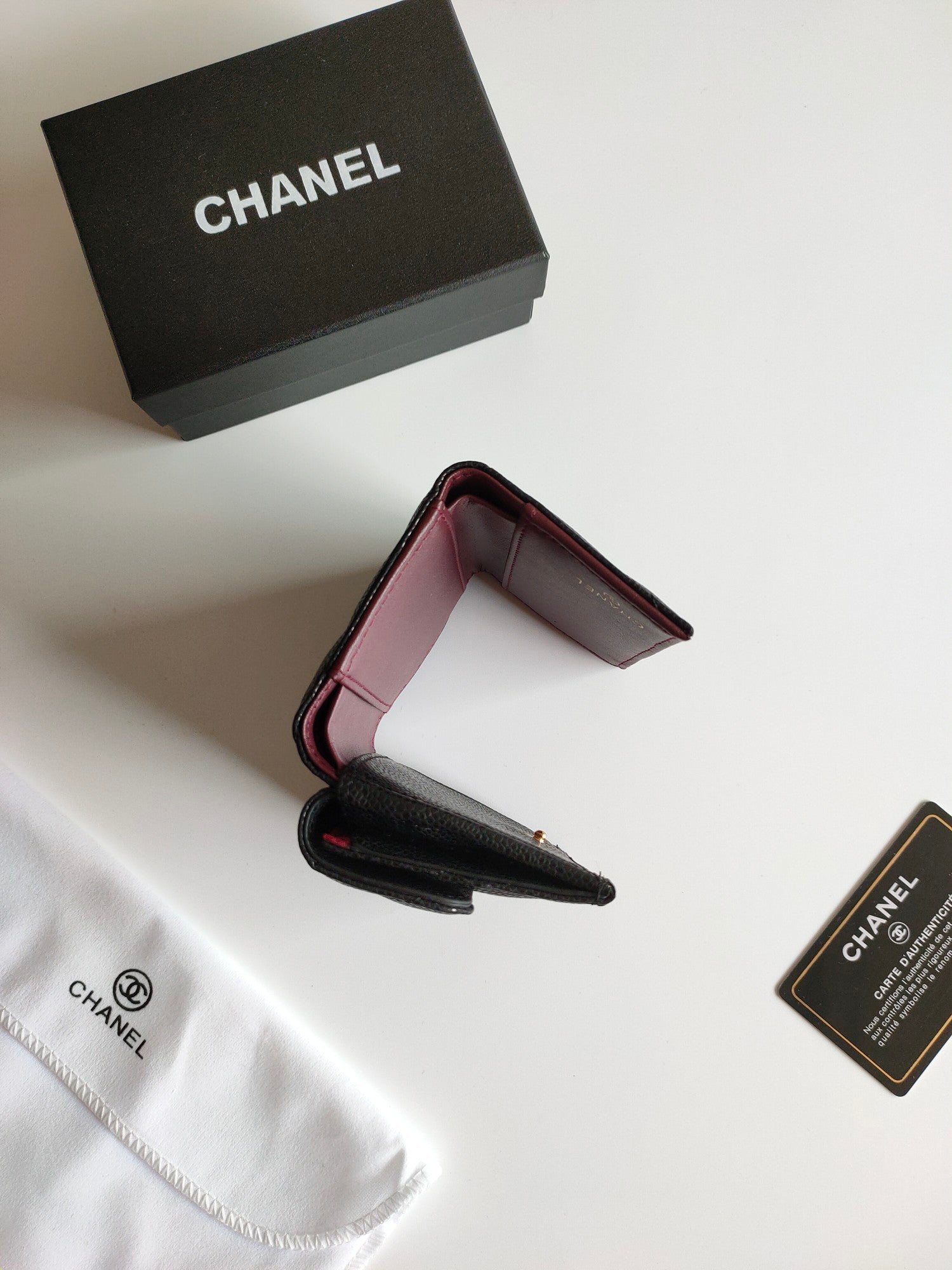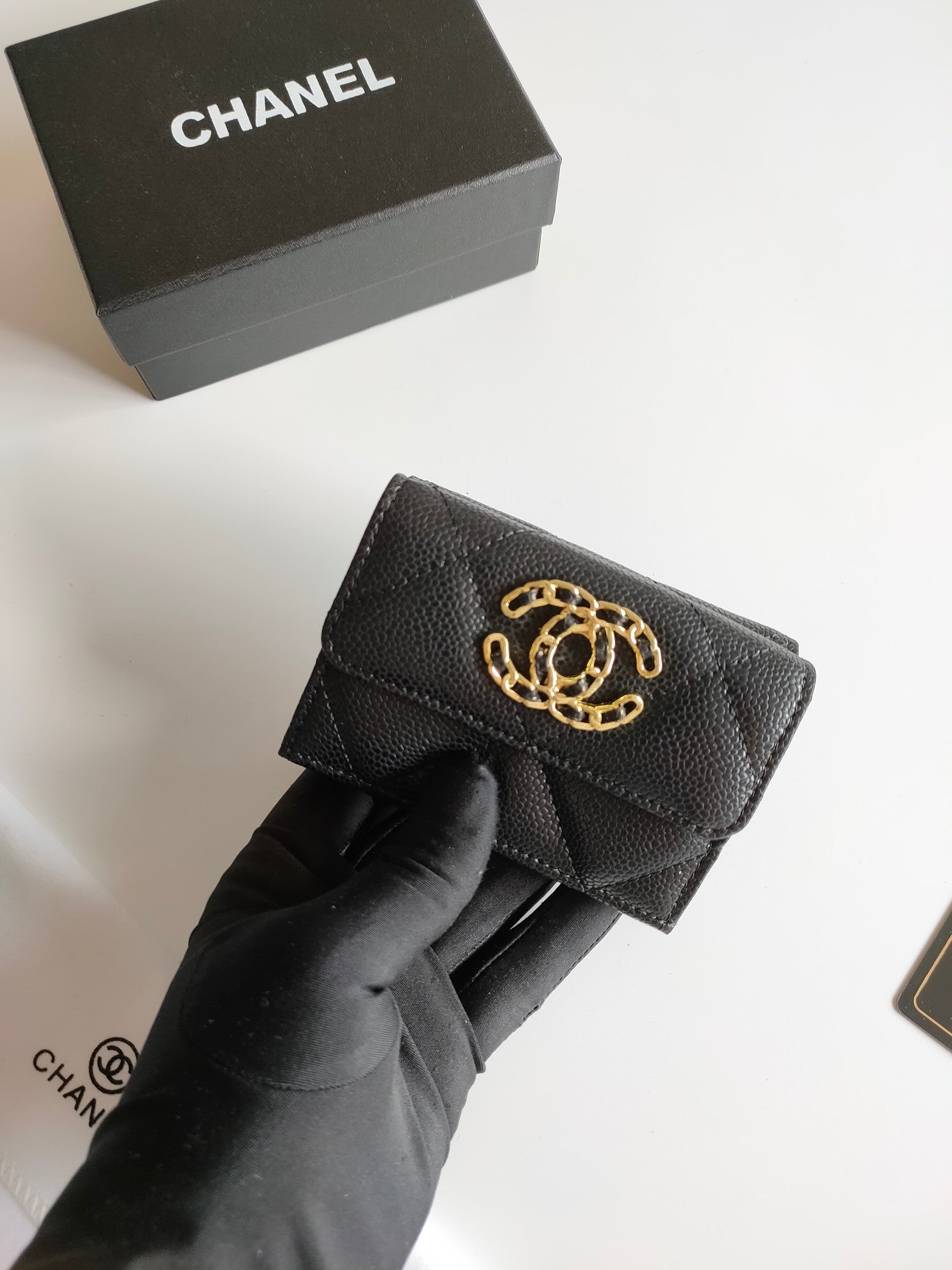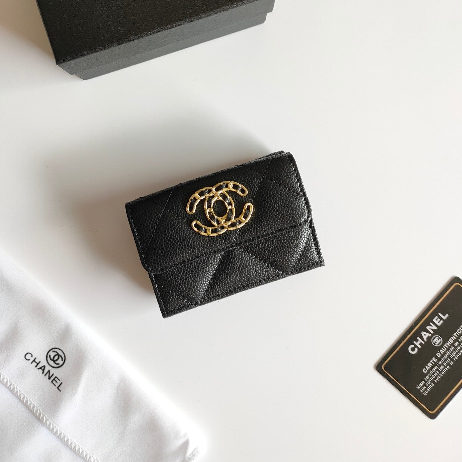 CC TRIFOLD PURSE 12 BLACK GRAINED CALFSKIN GOLD ICON