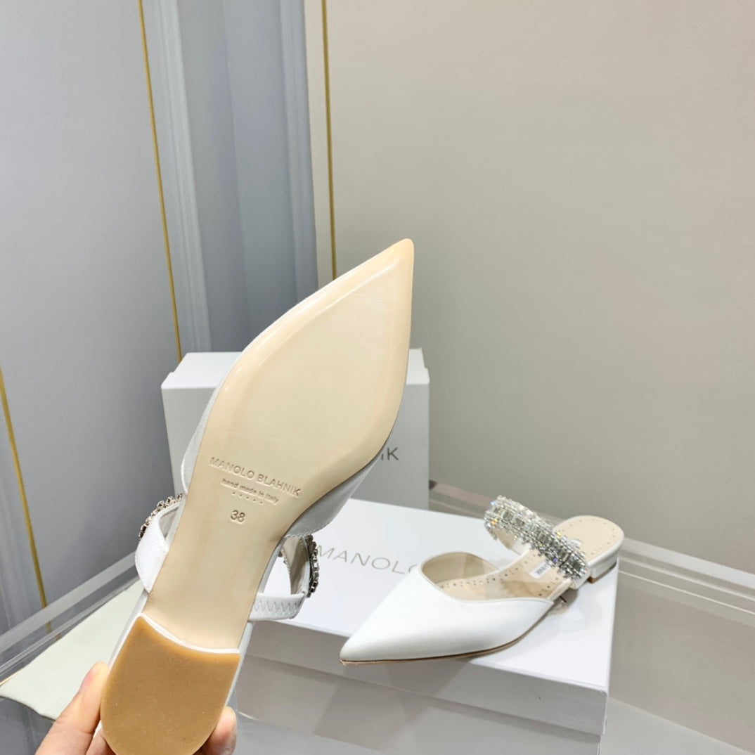 Manolo Flats Mules Diamond Buckle White Silk Satin 327486